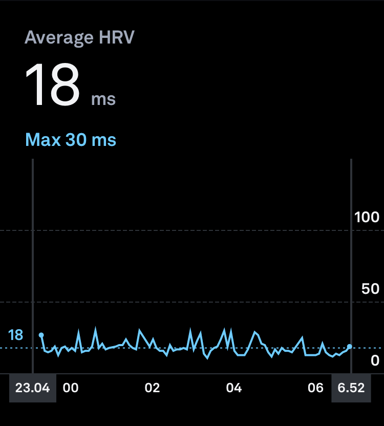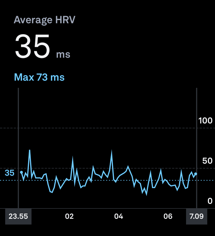 Tältä näyttää HRV-käyrä itselläni suhtkoht normaalin yön jälkeen: