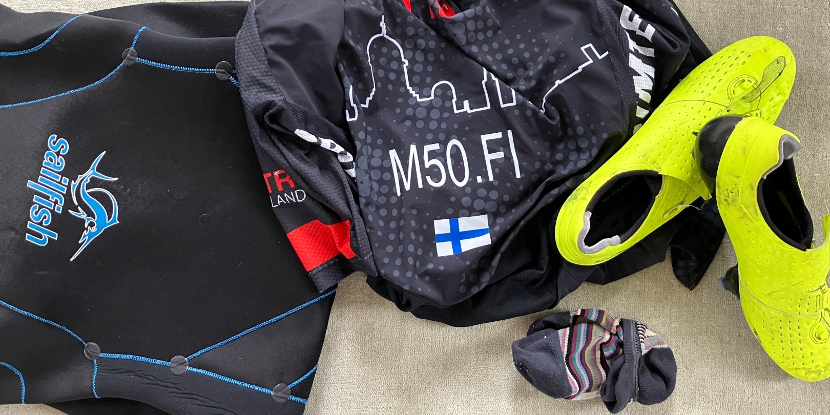 Gear on muuten aika lailla sama kuin viimeksi. Uusi märkäpuku oli jo testikisakäytössä Vantaalla kesäkuussa ja on parempi kuin edellinen. Koko on nyt oikeampi (luulen, että osa hengitysvaikeuksistani on johtunut siitä, että vanha puku oli yläkropan kohdalta aika tiukka), ja uusi malli kelluttaakin vähän paremmin.